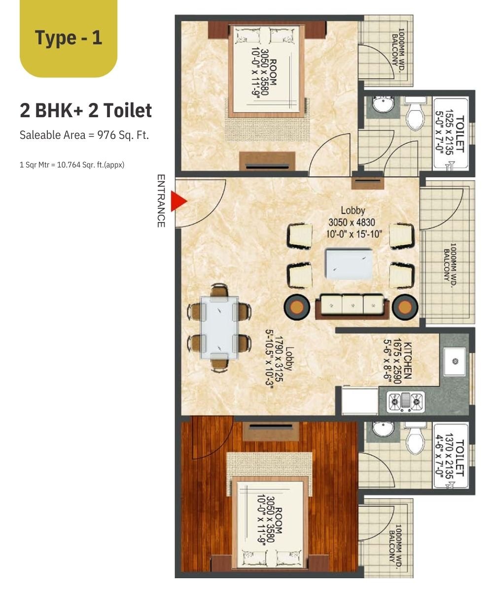 TYPE 1 ( 2 BHK + 2 TOILETS )