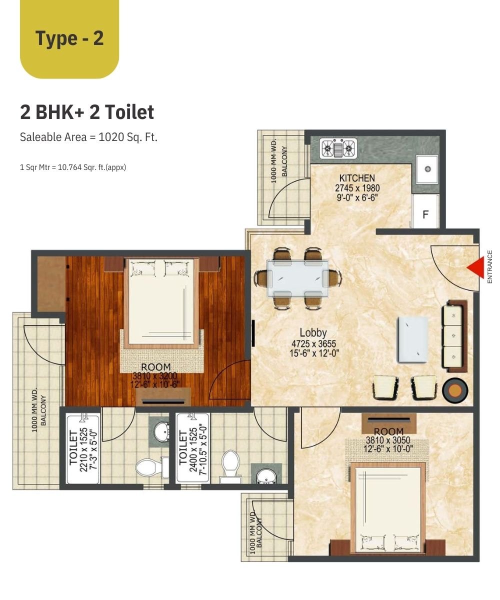 TYPE 2 ( 2 BHK + 2 TOILETS )